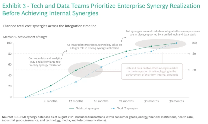 This central role spans the entire PMI timeline, starting with the integration of data sets in horizon 1 and the rationalization of business systems (such as in finance and accounting) in horizon 2. Although technology teams initially trail business teams in delivering their own synergies because of their focus on business needs, they catch up by the end of the integration effort. (See Exhibit 3.)