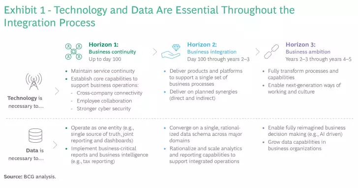 Technology and data play essential roles throughout the three horizons of the integration process. (See Exhibit 1.)